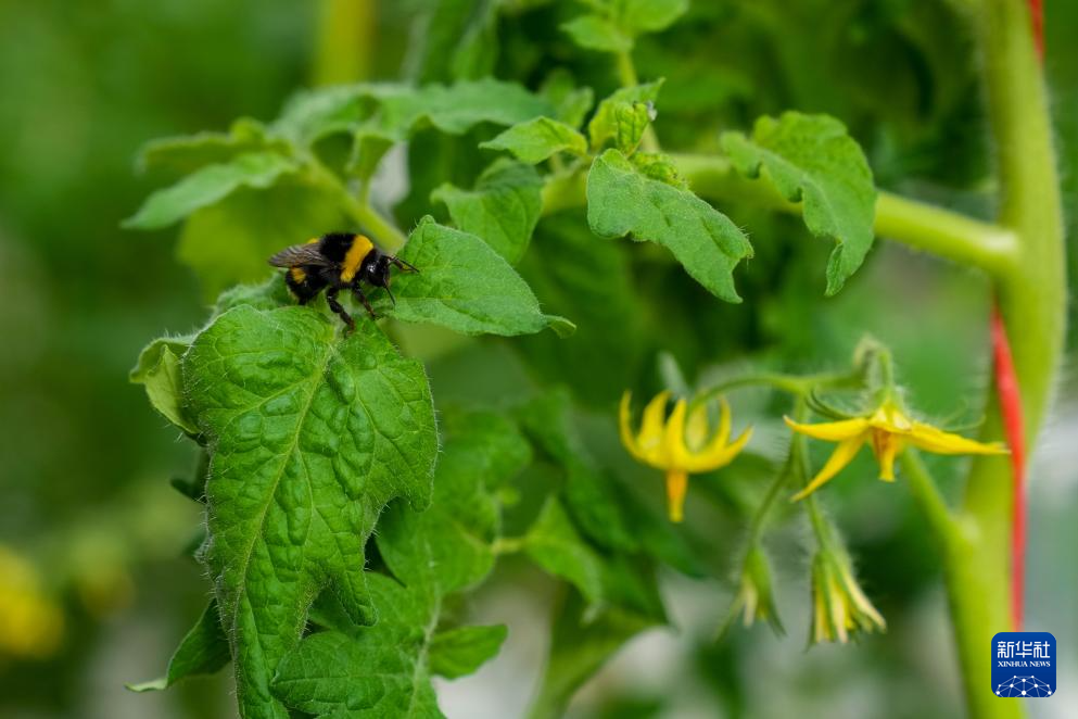 3月18日,在凯盛浩丰(佳木斯)智慧农业产业园的智能温室内,授粉蜜蜂落在番茄叶上。