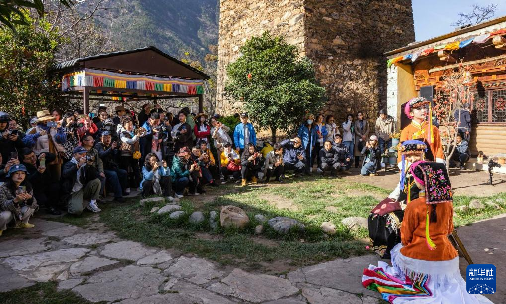 “花开丹巴·为梨而来”2024美人谷·丹巴梨花春赏季活动在丹巴县中路藏寨开启,游人在观赏拍摄嘉绒藏族民俗风情展示(3月21日摄)。