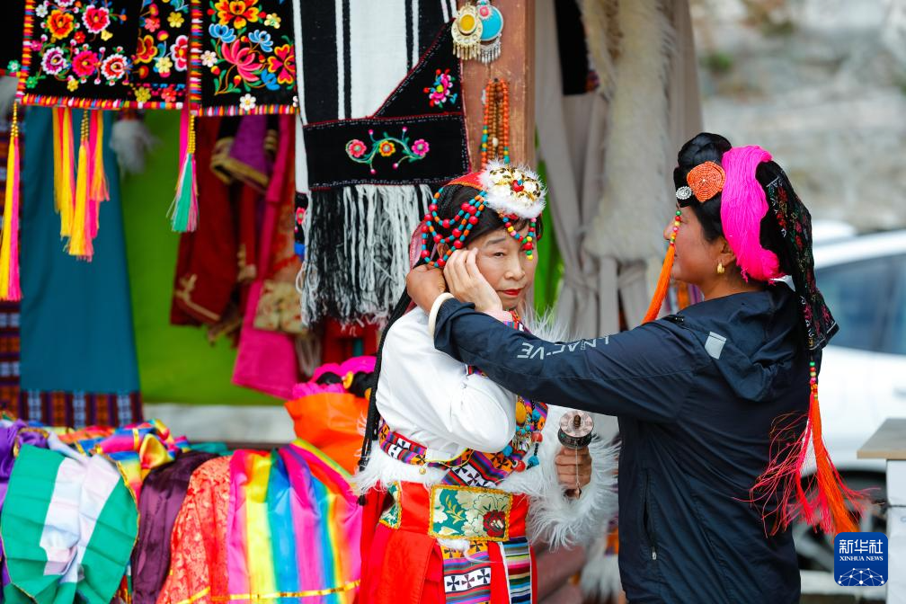 3月23日,在丹巴县甲居藏寨,游客(左)换上藏族服饰准备拍照。
