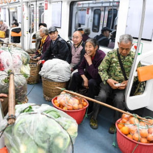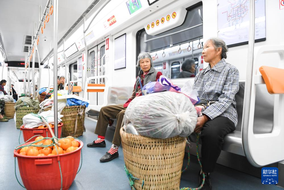 3月27日清晨,菜农乘坐重庆轨道交通4号线,准备前往城区的菜市场售卖农产品。