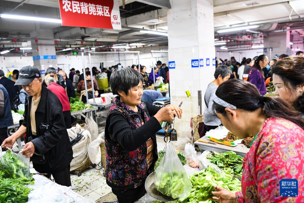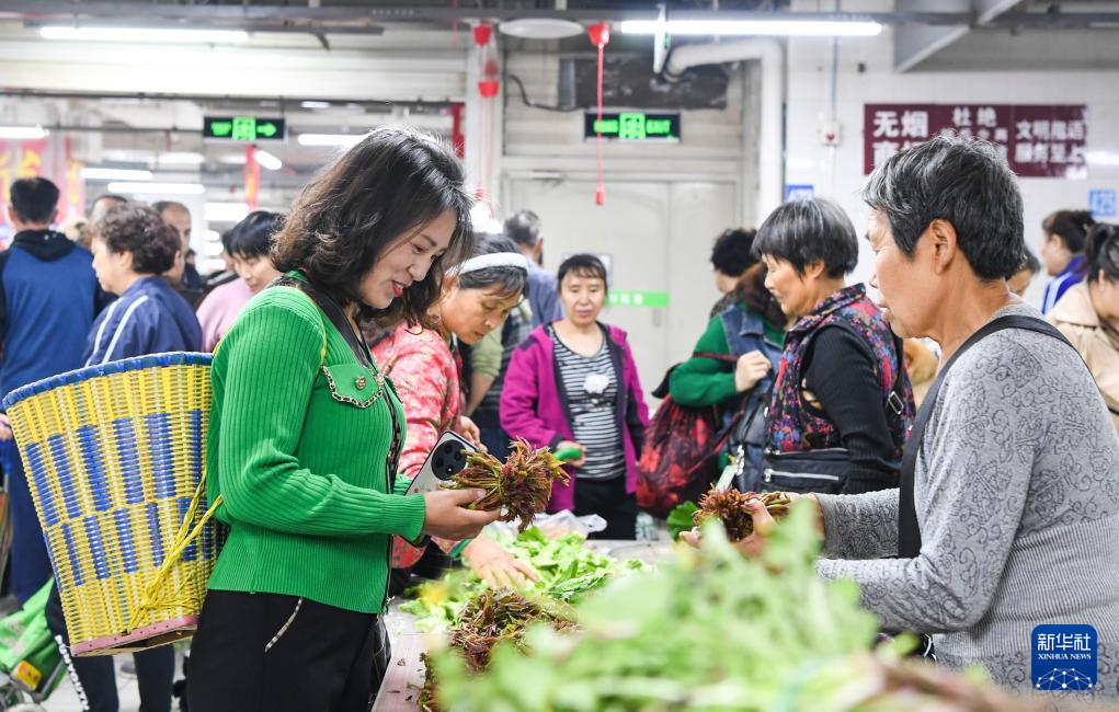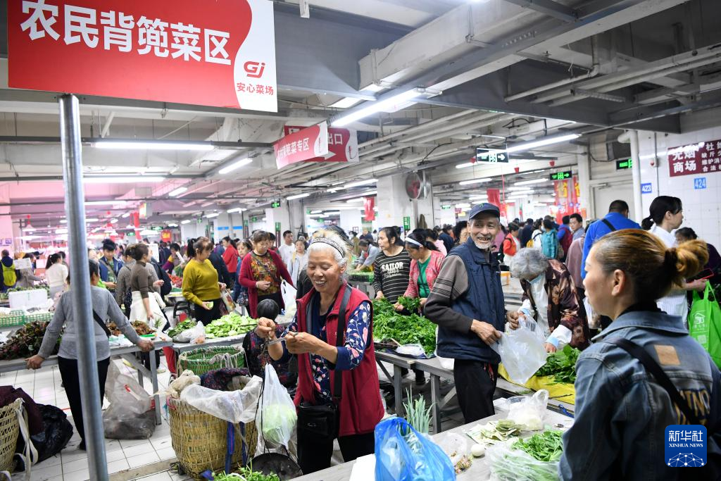 3月27日,市民在重庆市江北区新民乐安心菜场“农民背篼菜区”选购农产品。