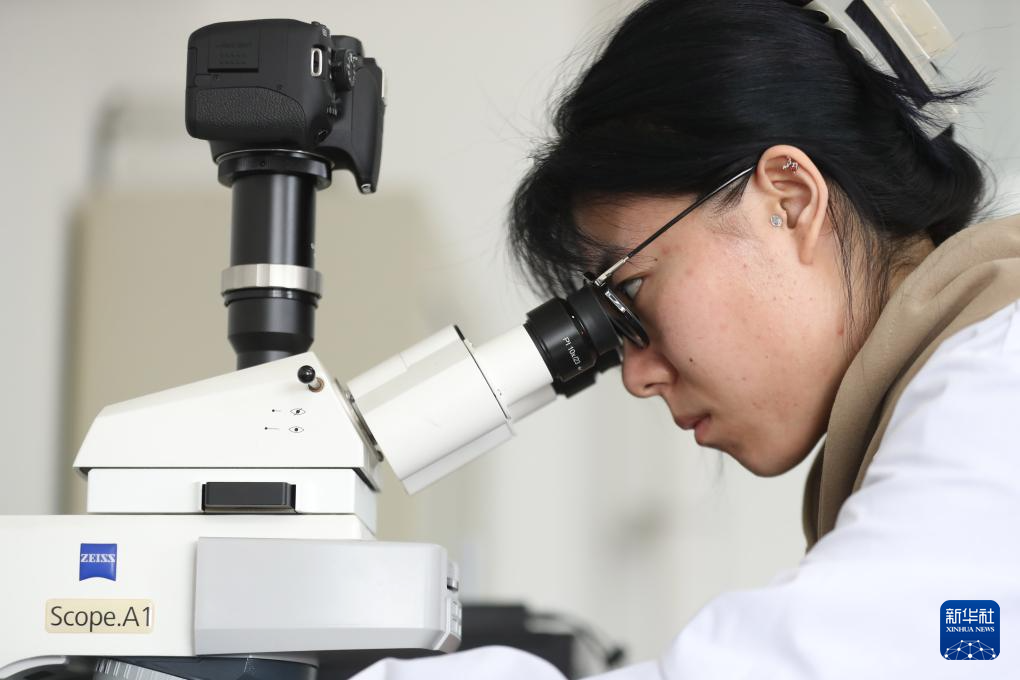 4月3日,在位于沈阳农业大学的土肥高效利用国家工程研究中心实验室,工作人员在观察土壤微形态薄片。