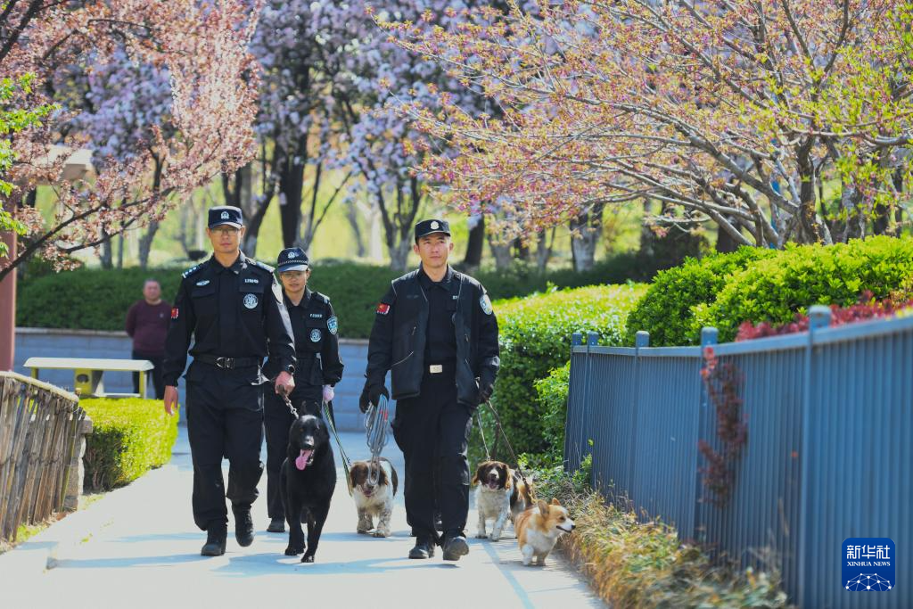 4月7日,“福仔”观看战友“小黑”的扑咬训练。