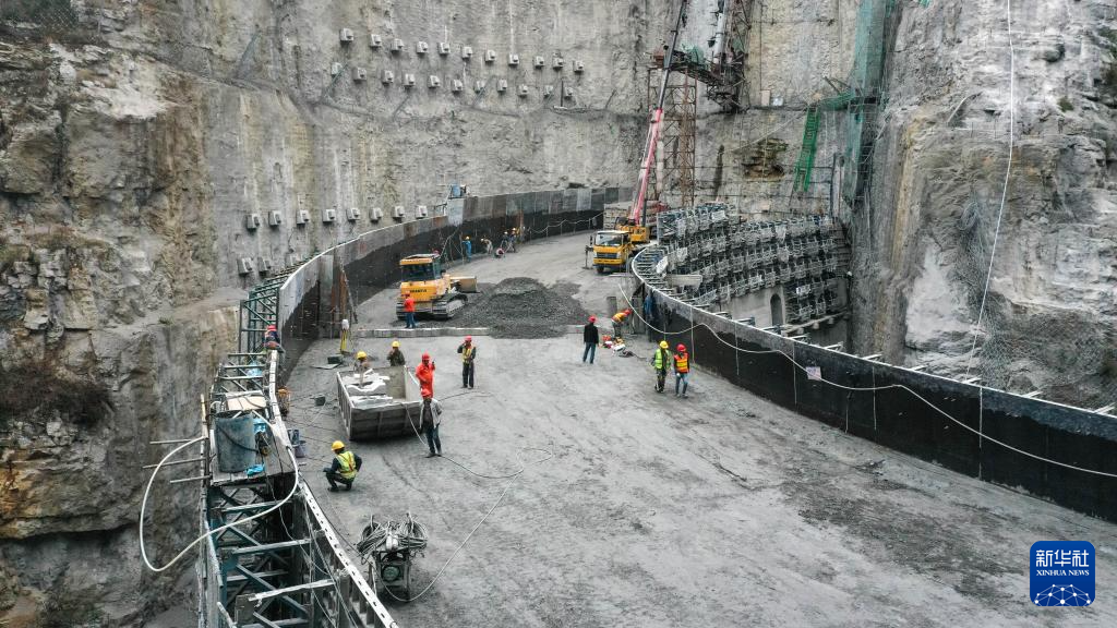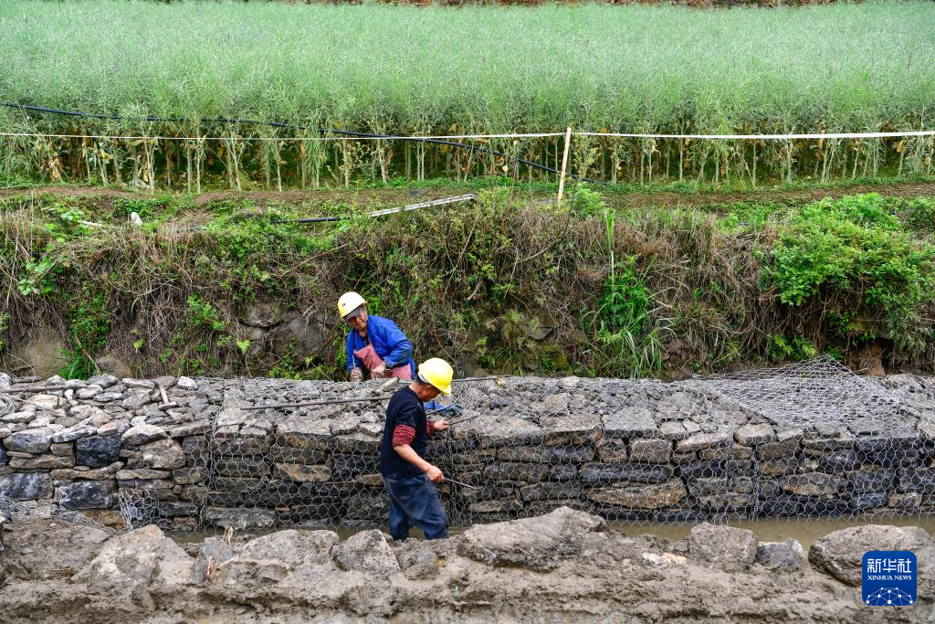 4月10日,工人在贵州省安顺市平坝区十字乡九甲村暗流河河道治理工程现场施工。