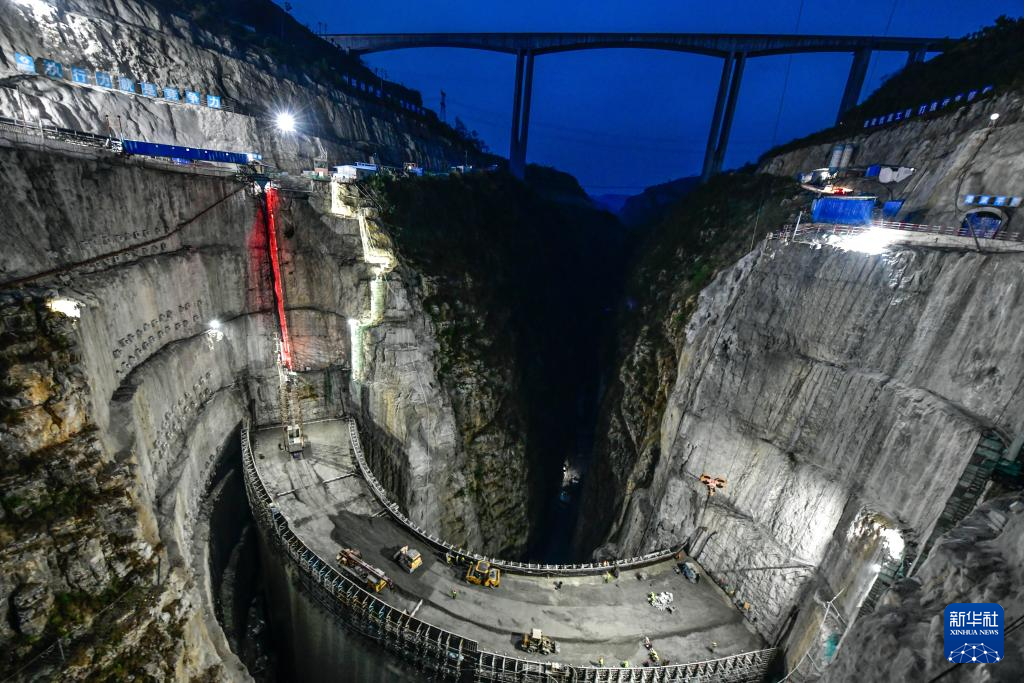 4月10日,工人在贵州省黔西市凹水河水库大坝上连夜施工。