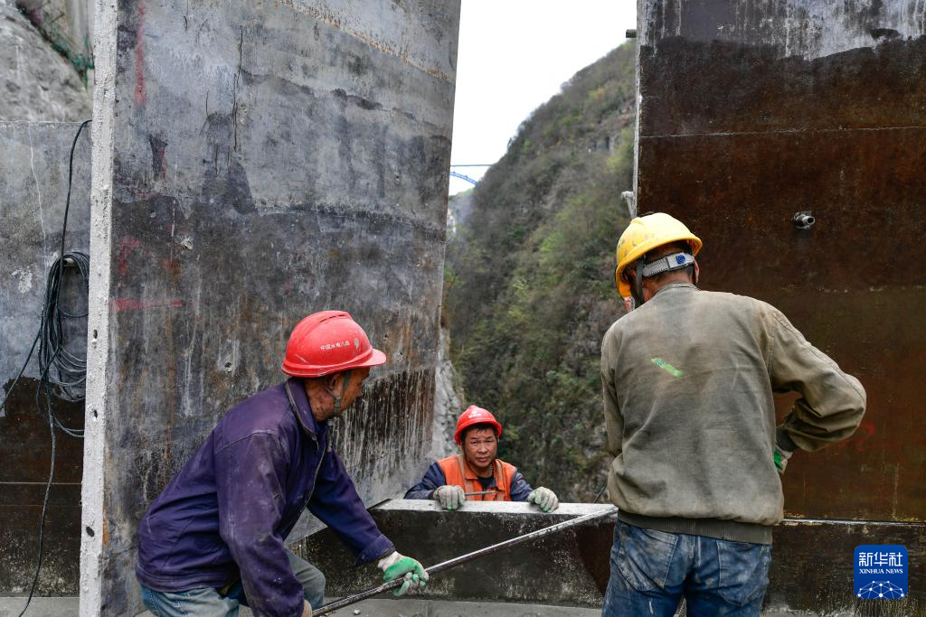 4月10日,工人在贵州省黔西市凹水河水库大坝上施工。