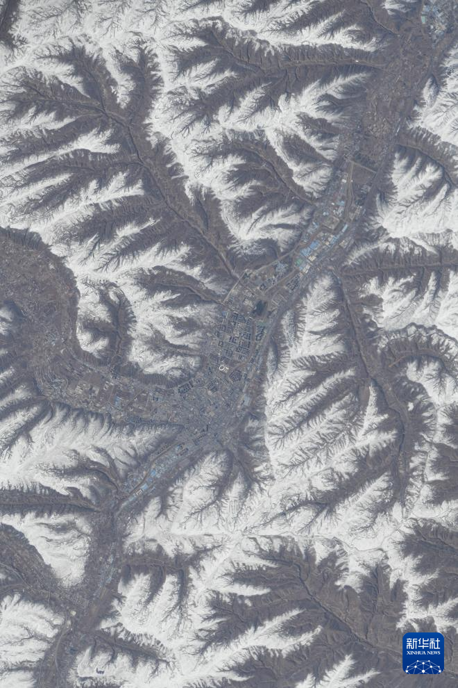 这是神舟十七号航天员汤洪波在中国空间站拍摄的兰州、中川机场和刘家峡水库。