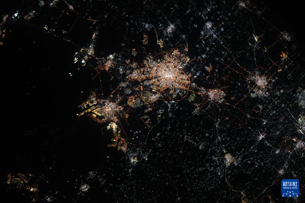 这是神舟十七号航天员汤洪波在中国空间站拍摄的天津夜景。