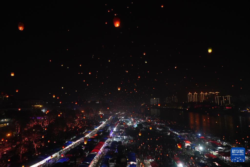 4月13日晚,人们在云南省景洪市澜沧江边放飞孔明灯。