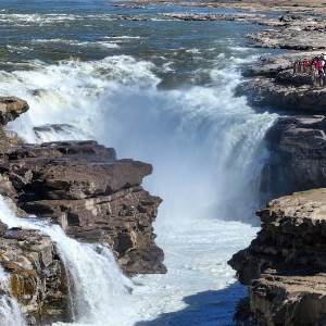 近日,受上游降雨量较少和水库调节水量影响,黄河晋陕峡谷水流变缓,水色变清,壶口瀑布出现“清流飞瀑”景观。