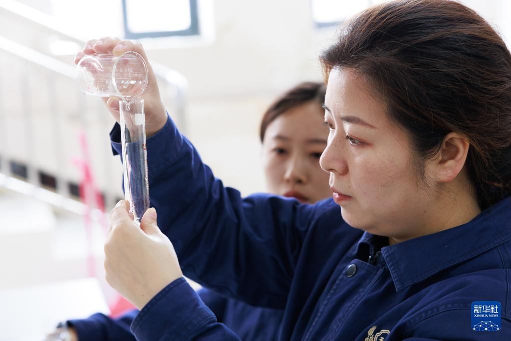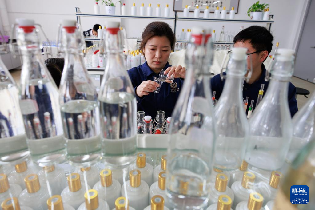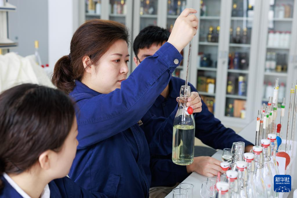 在贵州省遵义市汇川区北郊十字铺贵州珍酒厂区勾调室,王应招(右)进行勾调(4月23日摄)。