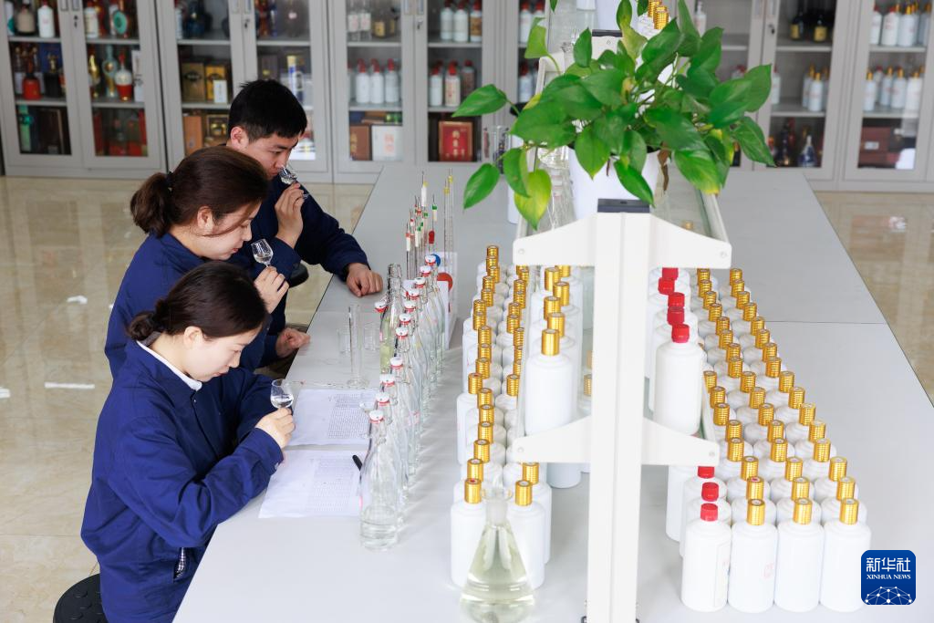 在贵州省遵义市汇川区北郊十字铺贵州珍酒厂区品酒室,王应招(左)进行新酒分级(4月23日摄)。