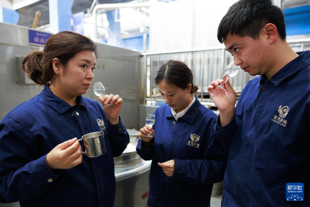在贵州省遵义市汇川区北郊十字铺贵州珍酒厂区生产车间,王应招(左)带领徒弟一起鉴定酒体度数(4月23日摄)。
