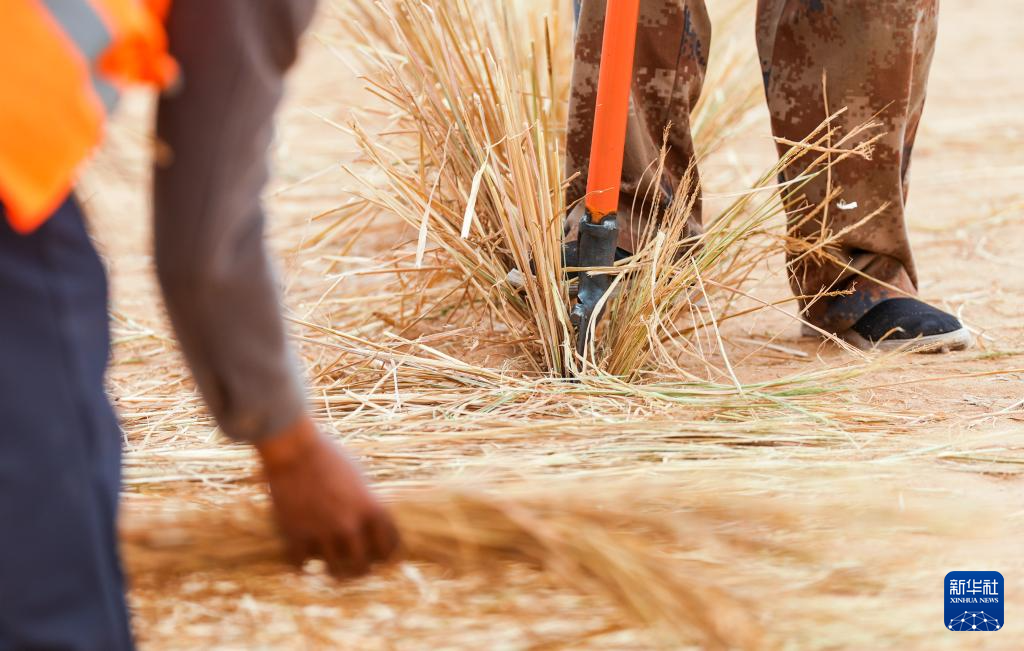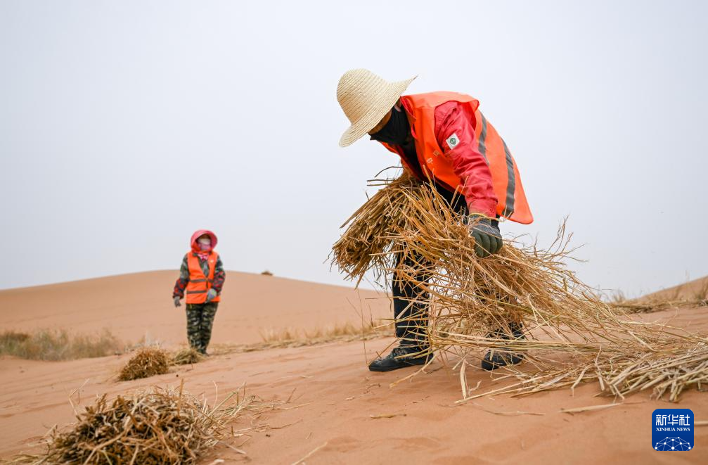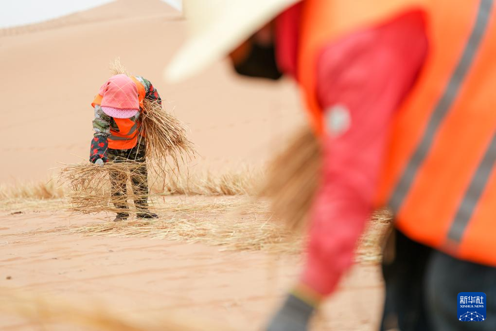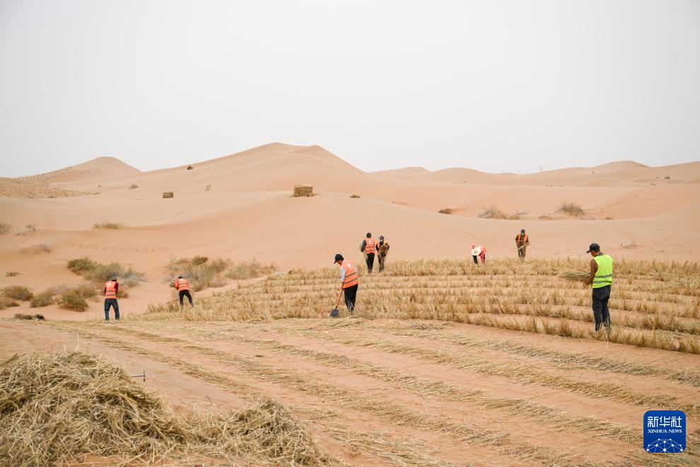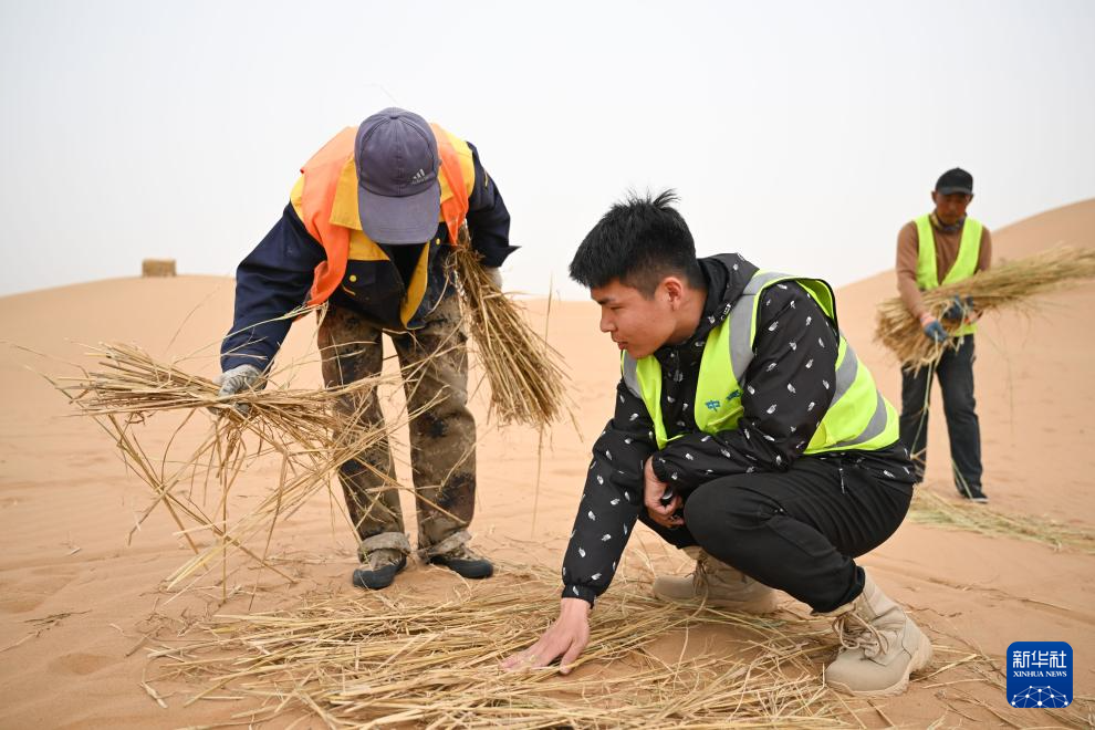 4月27日,治沙工人用稻草在沙漠中扎草方格。