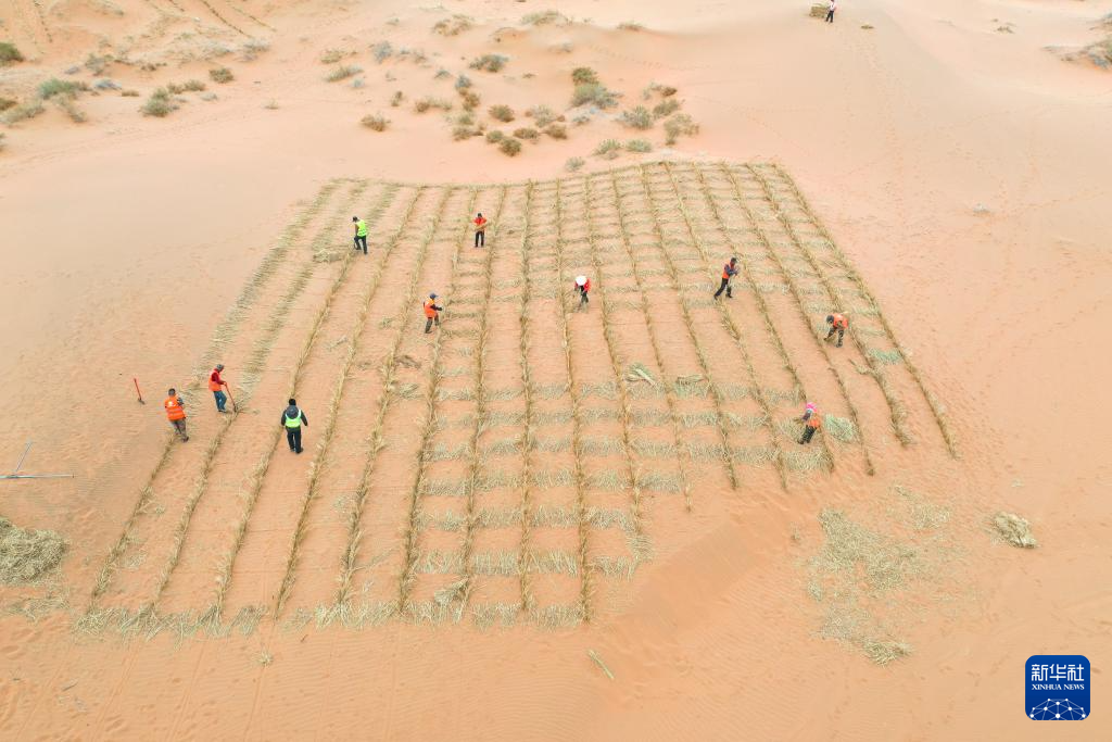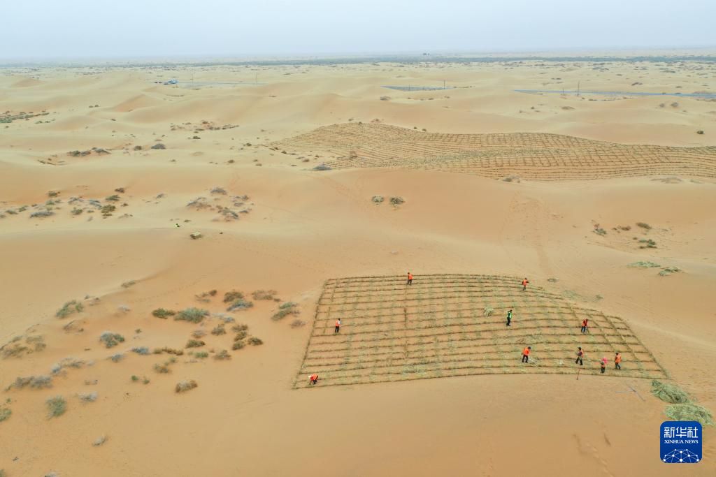 4月27日,治沙工人用稻草在沙漠中扎草方格(无人机照片)。