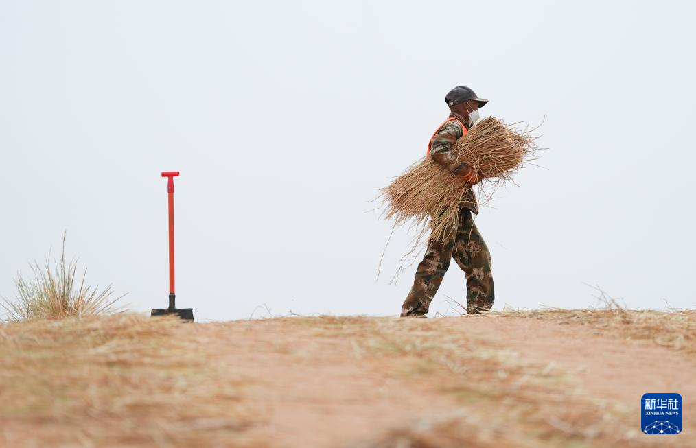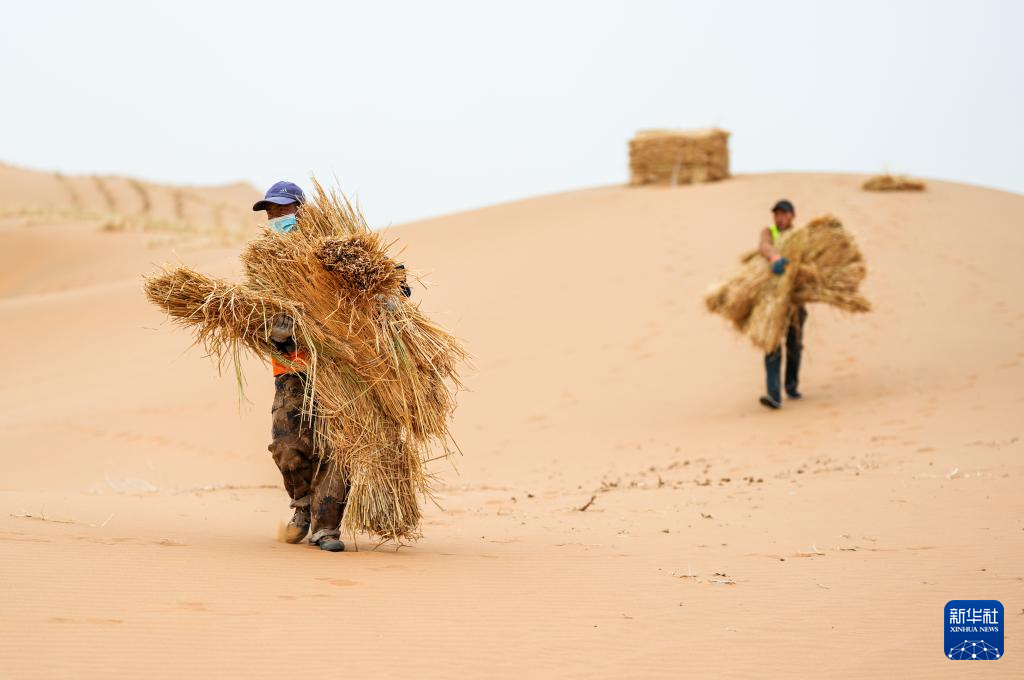 4月27日,治沙工人搬运稻草准备在沙漠中扎草方格。