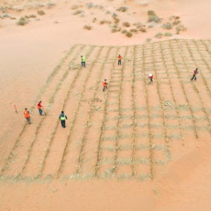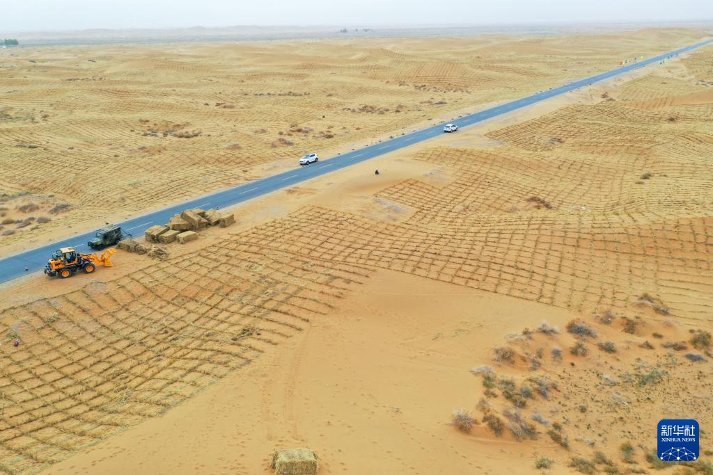 近日,在内蒙古阿拉善左旗腾格里沙漠S315沿线固沙工程现场,工人们忙着扎草方格,种植沙生植物。此次治沙涵盖乌兰布和沙漠、巴丹吉林沙漠东缘、腾格里沙漠、雅布赖山等七个片区,项目主要布局在沙漠边缘地带、重要道路两边、重点城镇周围,采取飞播造林、人工造林种草、工程固沙等综合措施开展防沙治沙和荒漠化治理。