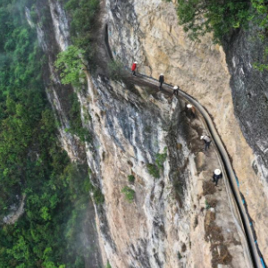 身旁是刀削斧劈般的悬崖绝壁,脚下是云雾缭绕的万丈深渊,护渠队员们忙着清理水渠里淤塞的枯枝、滚落的山石,这是贵州省毕节市七星关区生机镇的绝壁天渠巡护现场。