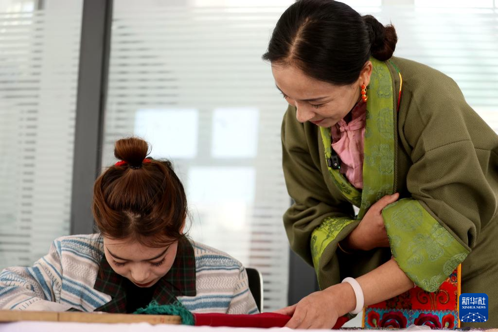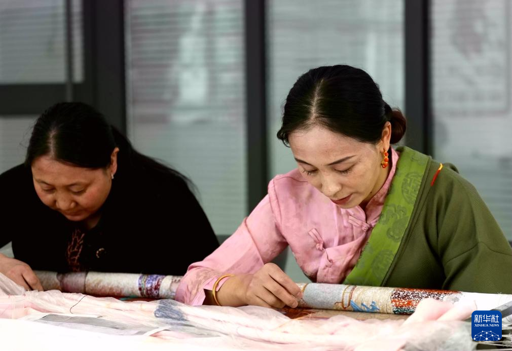 4月23日,拉毛叶忠(右)在指导绣娘制作藏绣作品。
