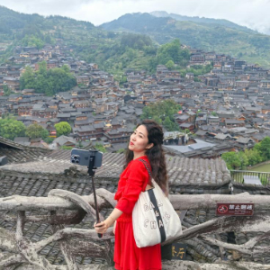 4月30日,游客在西江千户苗寨观景台上自拍。