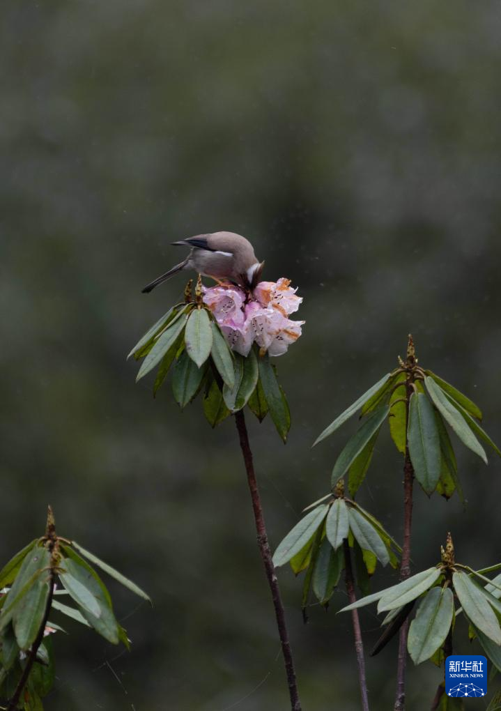 在瓦屋山景区兰溪绝壁栈道旁,一只白颈凤鹛停留在杜鹃花上(5月11日摄)。
