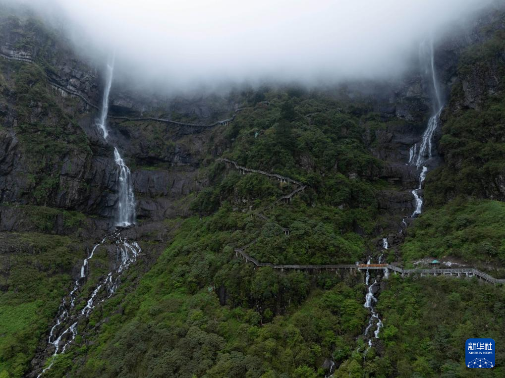 俯瞰瓦屋山景区兰溪绝壁栈道和兰溪瀑布(左)、鸯溪瀑布(5月11日摄,无人机照片)。