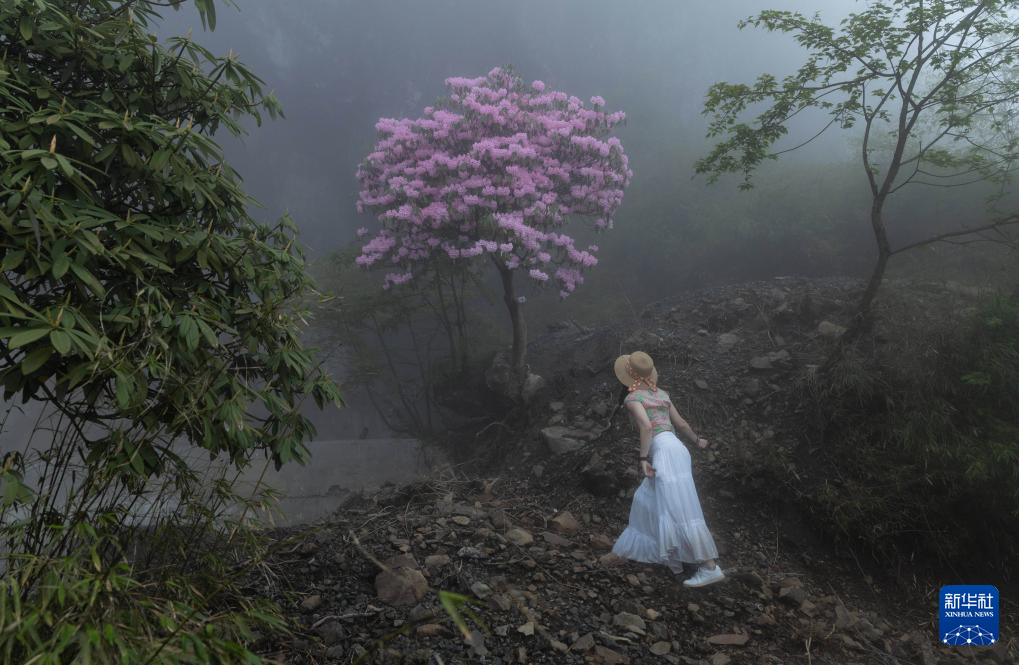 在瓦屋山景区半山画廊栈道边,一名游客走近一株盛开的杜鹃花树(5月11日摄)。