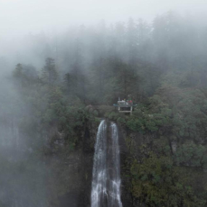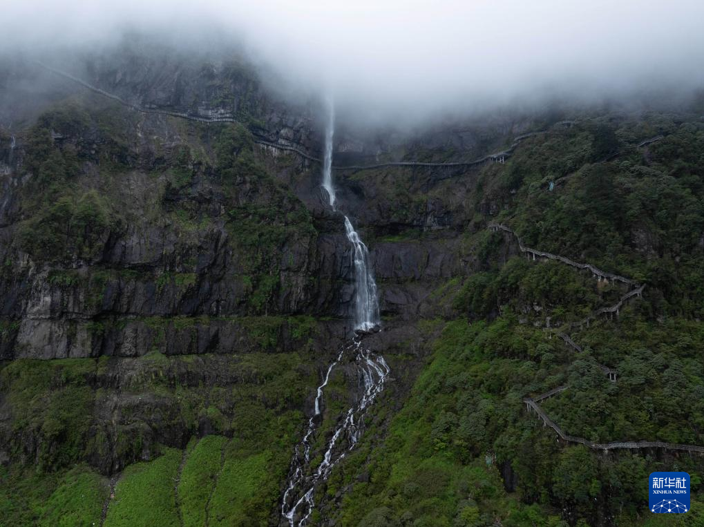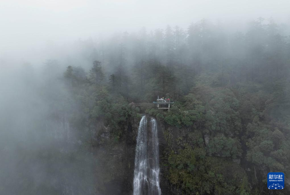 远眺云雾中的瓦屋山景区鸯溪瀑布及观景台(5月11日摄,无人机照片)。