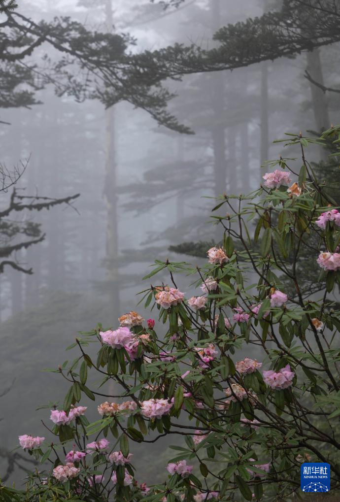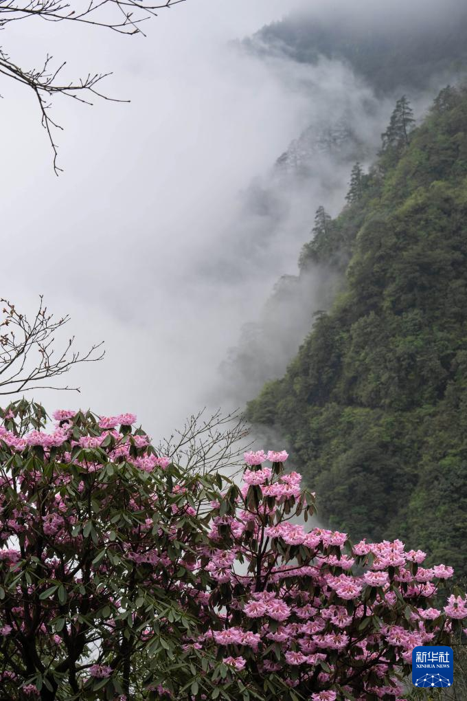 在瓦屋山景区半山画廊栈道上远眺杜鹃花和云雾中的山峦(5月11日摄)。