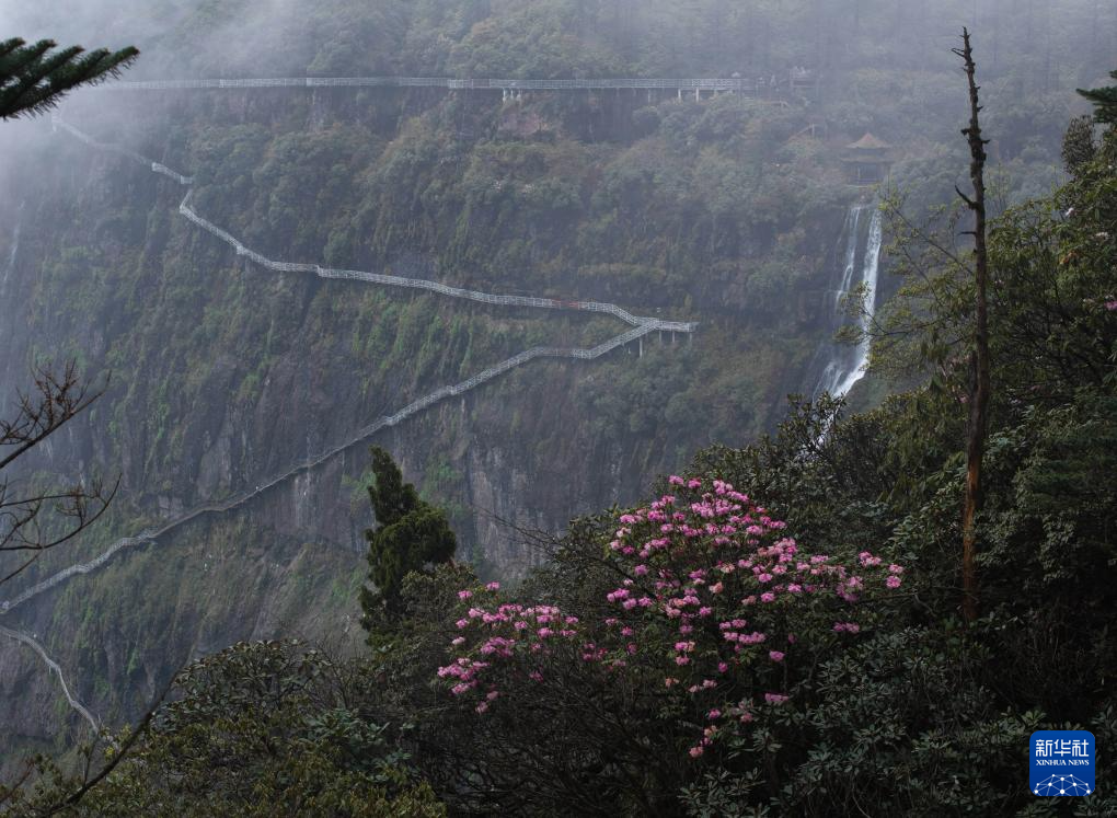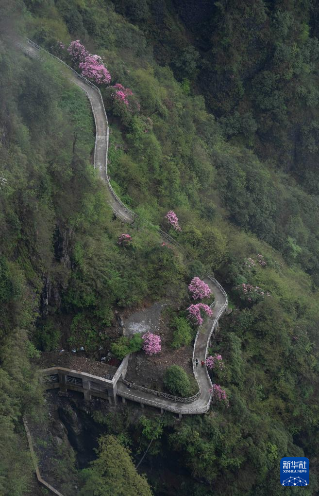 瓦屋山景区兰溪绝壁栈道旁盛开的杜鹃花(5月11日摄)。