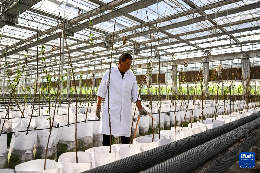 5月11日,在土默特右旗敕勒川现代农业产业园,工作人员在管护果树苗。