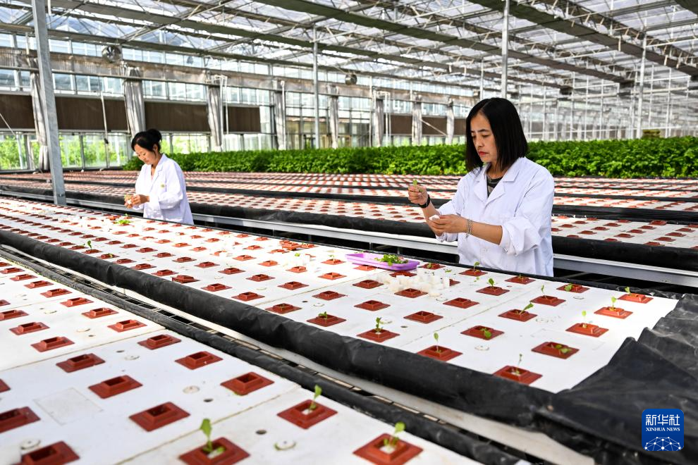 5月11日,在土默特右旗敕勒川现代农业产业园,工作人员在栽培蔬菜苗。