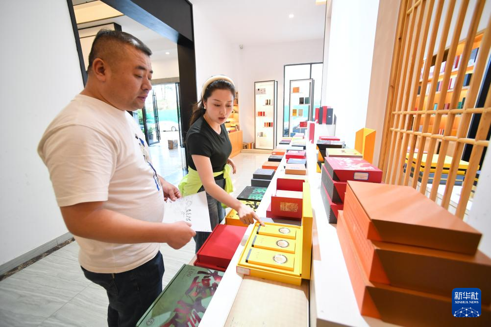 5月7日,在武夷山旺角包装文化创意园,顾客(右)在挑选茶叶包装礼盒。