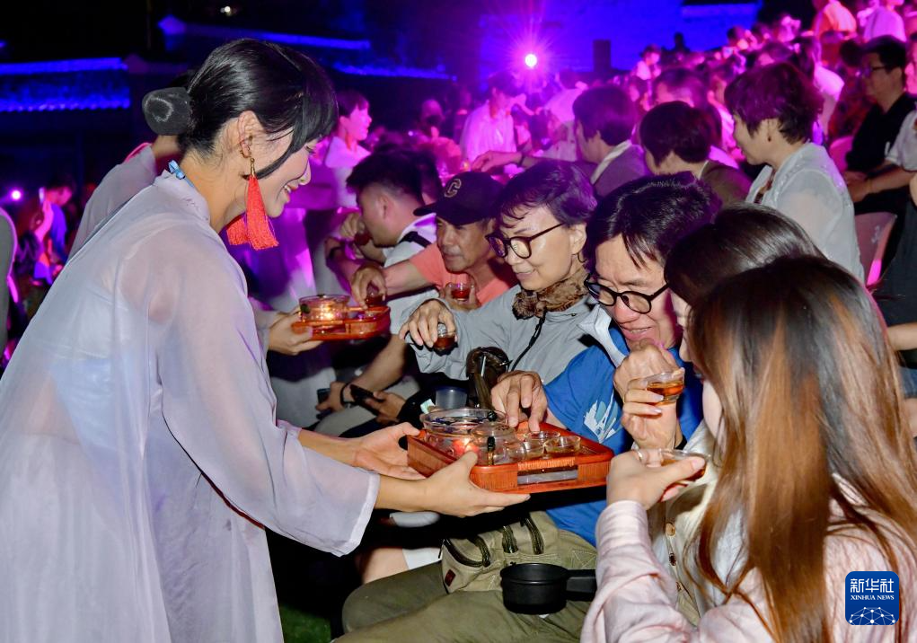 5月8日,在武夷山以茶文化为主题的印象大红袍山水实景演出中,演员为观众敬茶。