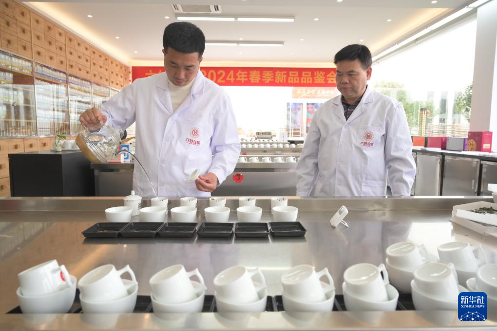 非物质文化遗产福鼎白茶制作技艺传承人陈家雅(左)在六妙白茶研发中心审评福鼎白茶(4月11日摄)。