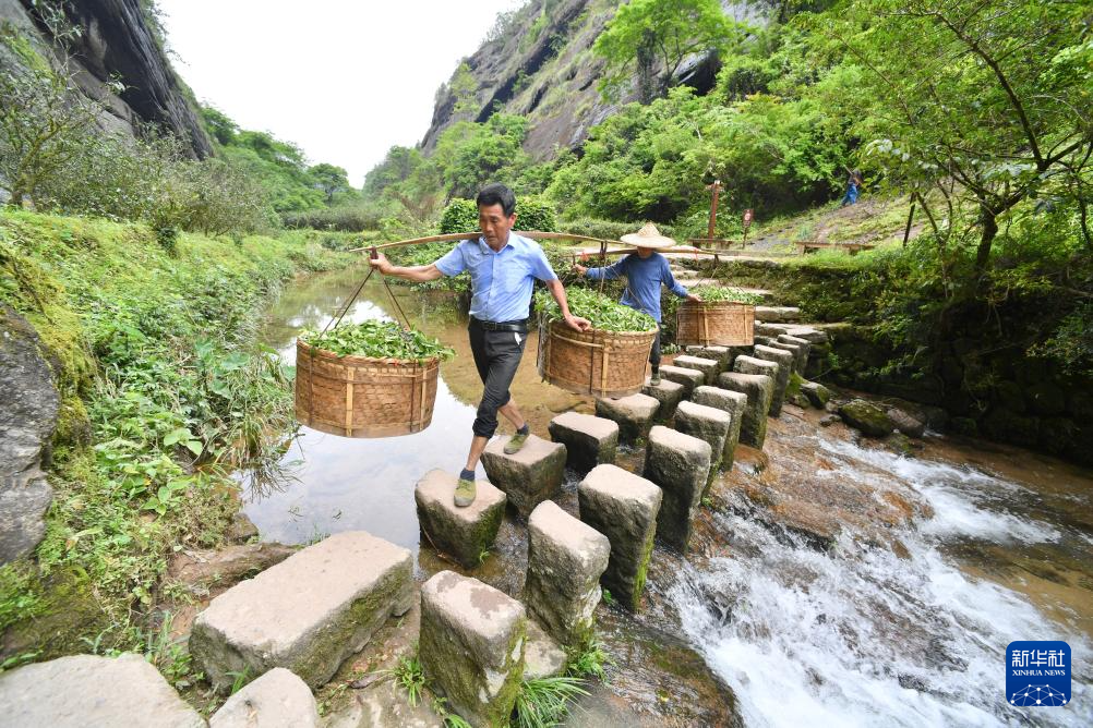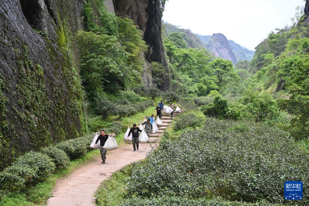 5月7日,在武夷山岩茶核心产区内,工人在挑运茶青。