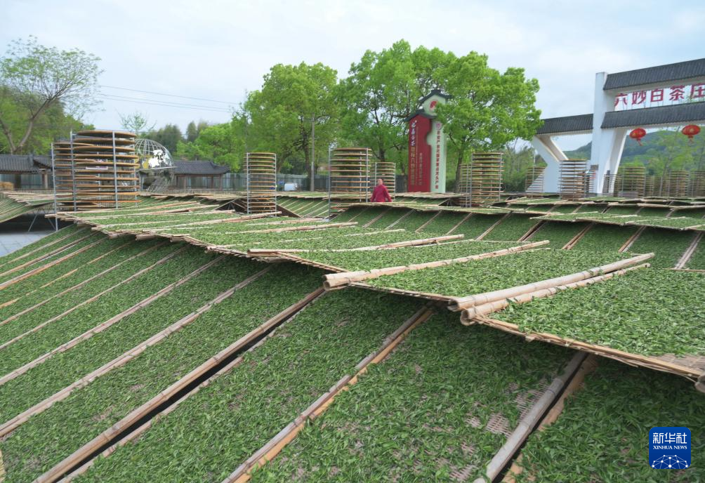 工人在位于福鼎市点头镇大坪村的六妙白茶庄园晾晒茶青(4月10日摄)。