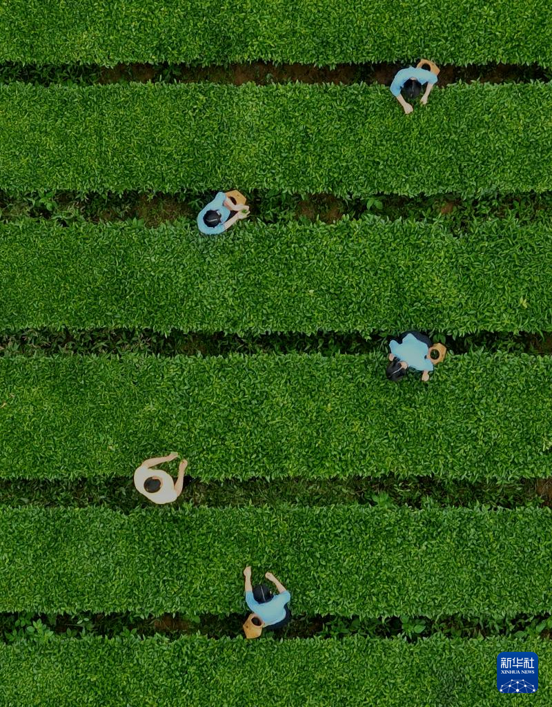 工人在安溪县西坪镇珠洋村的八马红星茶场茶园里采摘茶叶(5月9日摄,无人机照片)。