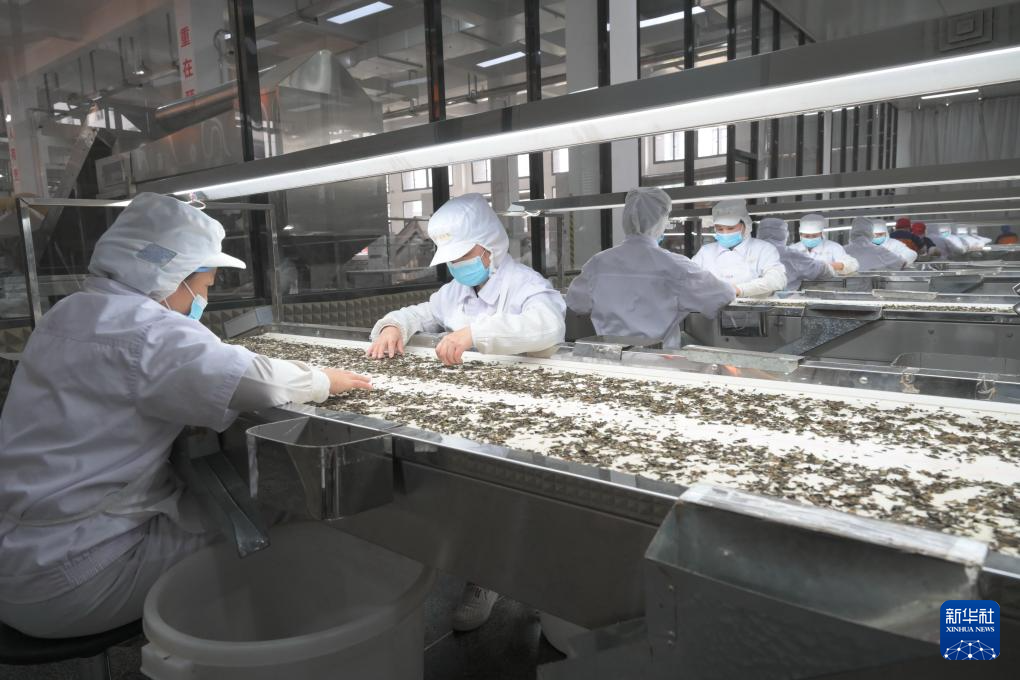 福建品品香茶业有限公司工人在生产车间流水线上剔除茶梗等杂质(4月10日摄)。