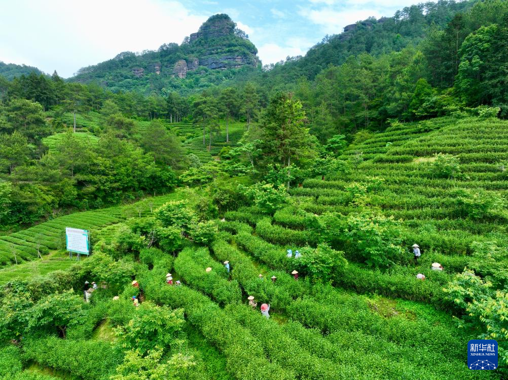 5月7日,在武夷山市星村镇燕子窠生态茶园内,工人在手工采茶(无人机照片)。