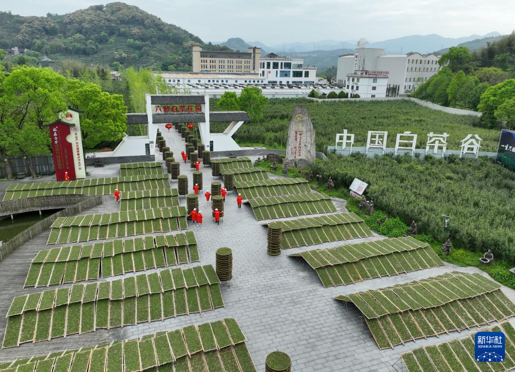 工人在位于福鼎市点头镇大坪村的六妙白茶庄园晾晒茶青(4月10日摄,无人机照片)。