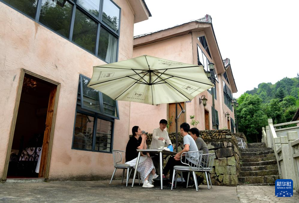 在安溪县西坪镇盖竹村的德峰茶庄园,几名游客在民宿旁品尝铁观音(5月9日摄)。