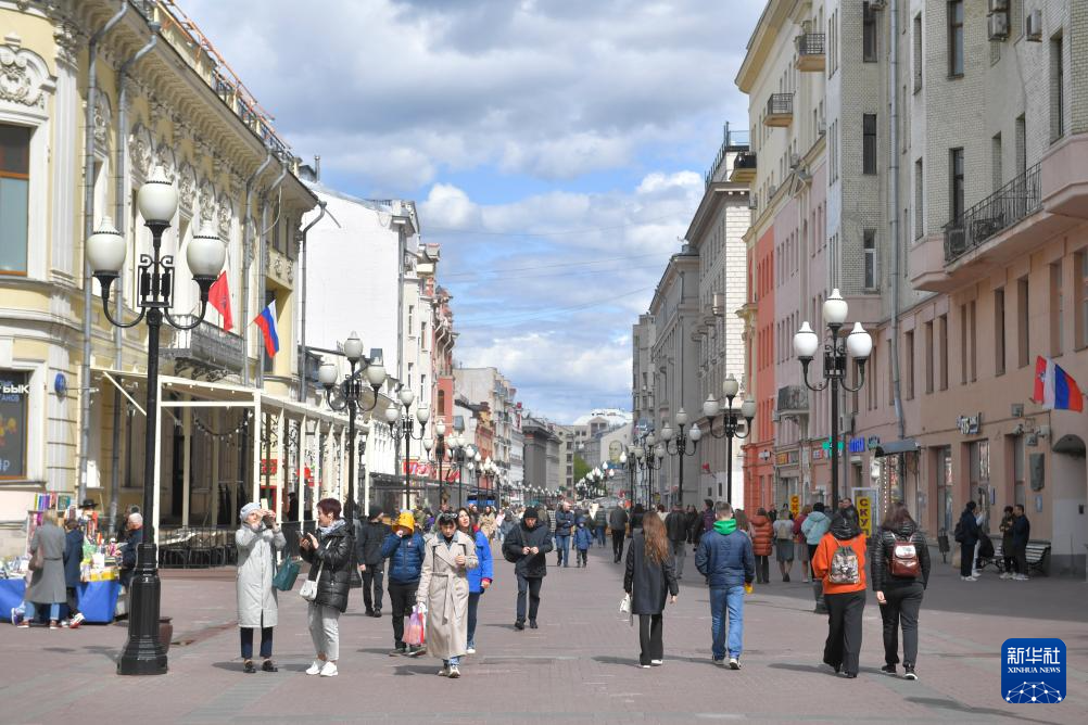 这是5月11日在俄罗斯首都莫斯科拍摄的老阿尔巴特街。