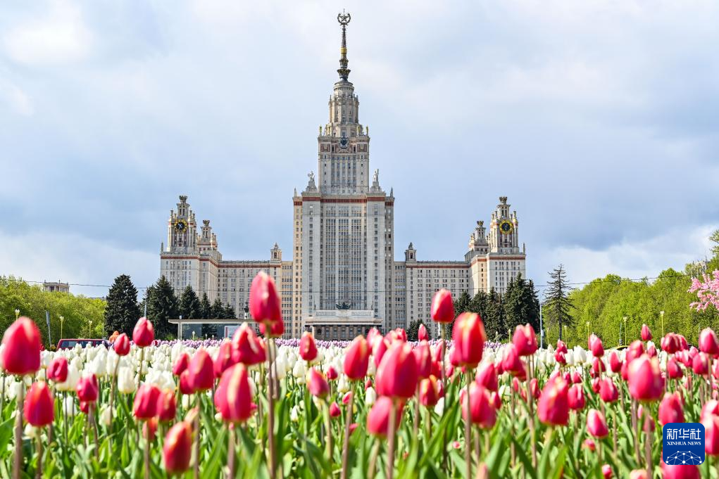 这是5月8日在俄罗斯首都莫斯科拍摄的莫斯科大学主楼。
