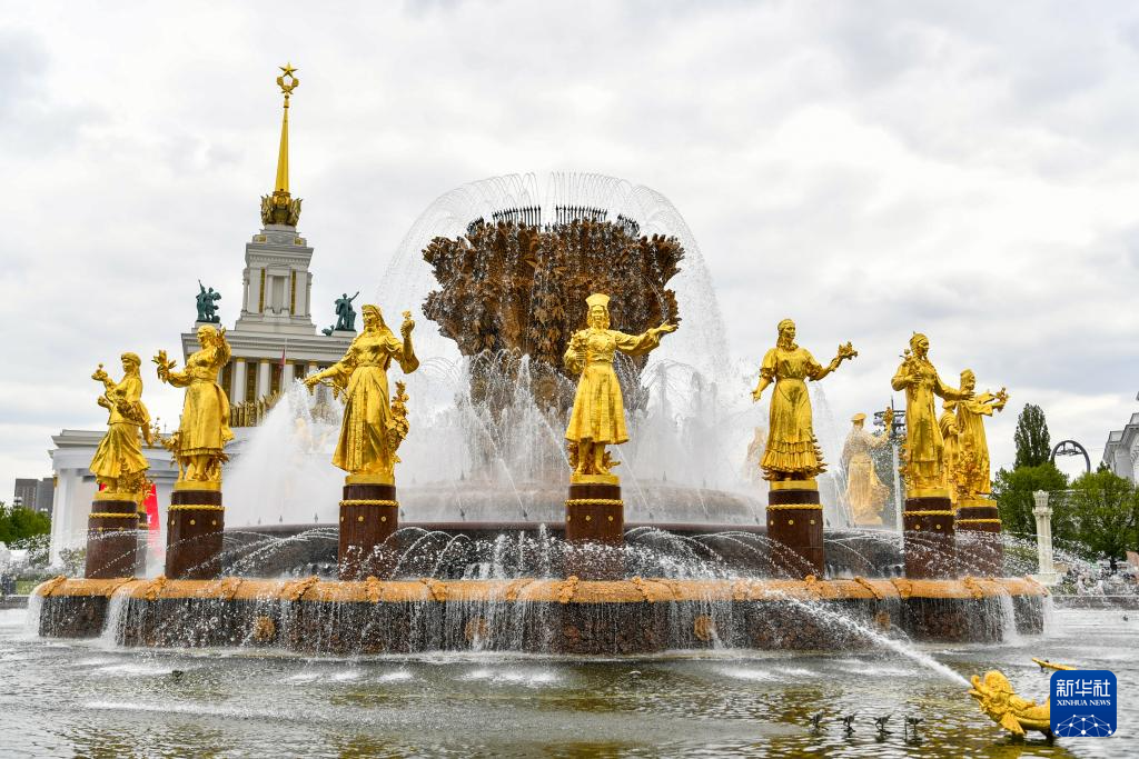 这是5月13日在俄罗斯首都莫斯科拍摄的国民经济成就展览馆的喷泉。