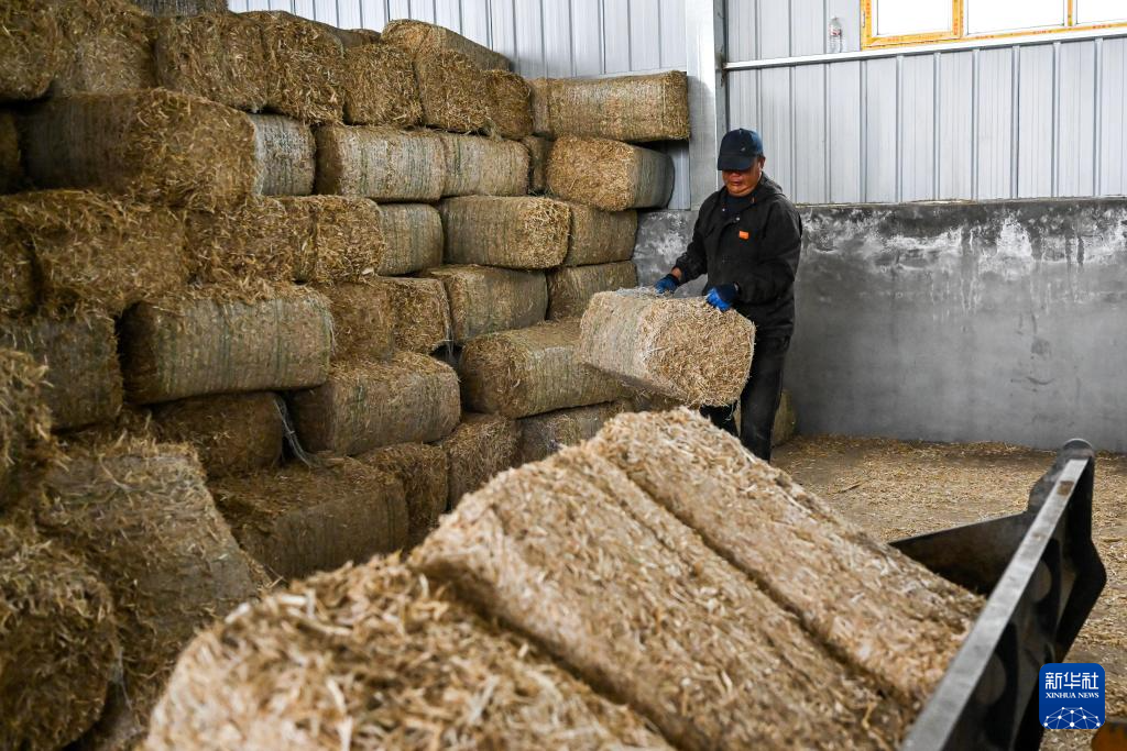 5月16日,牧民在西乌珠穆沁旗吉仁高勒嘎查股份经济合作社搬运草料。