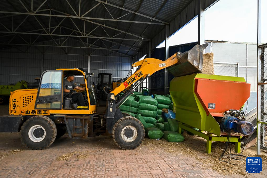 5月16日,牧民在西乌珠穆沁旗吉仁高勒嘎查股份经济合作社驾驶铲车将草料倒入搅拌设备。