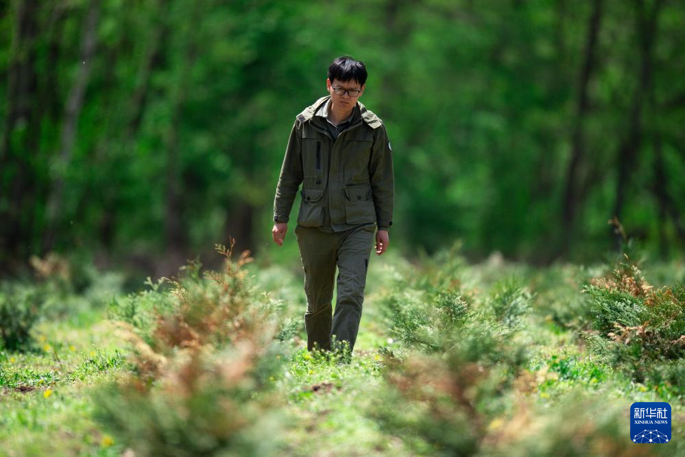 贾翔在长白山国家级自然保护区关注一株植物的生长状况(5月9日摄)。
