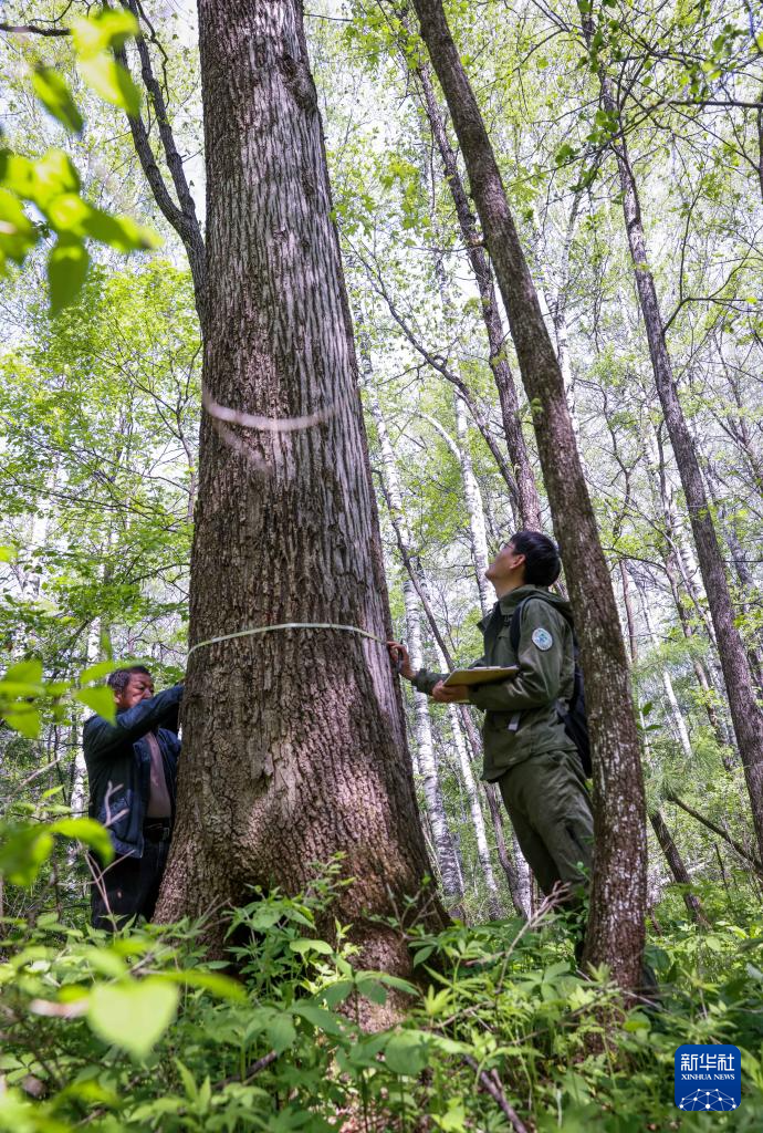 贾翔(右)和工作人员赵路福在长白山国家级自然保护区的植物固定监测样地测量记录树木生长数据(5月9日摄)。