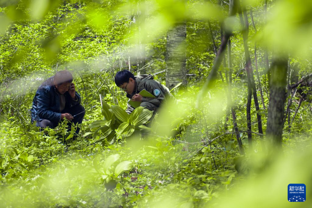 贾翔(右)和工作人员赵路福在长白山国家级自然保护区的植物固定监测样地进行植物群落调查研究(5月9日摄)。